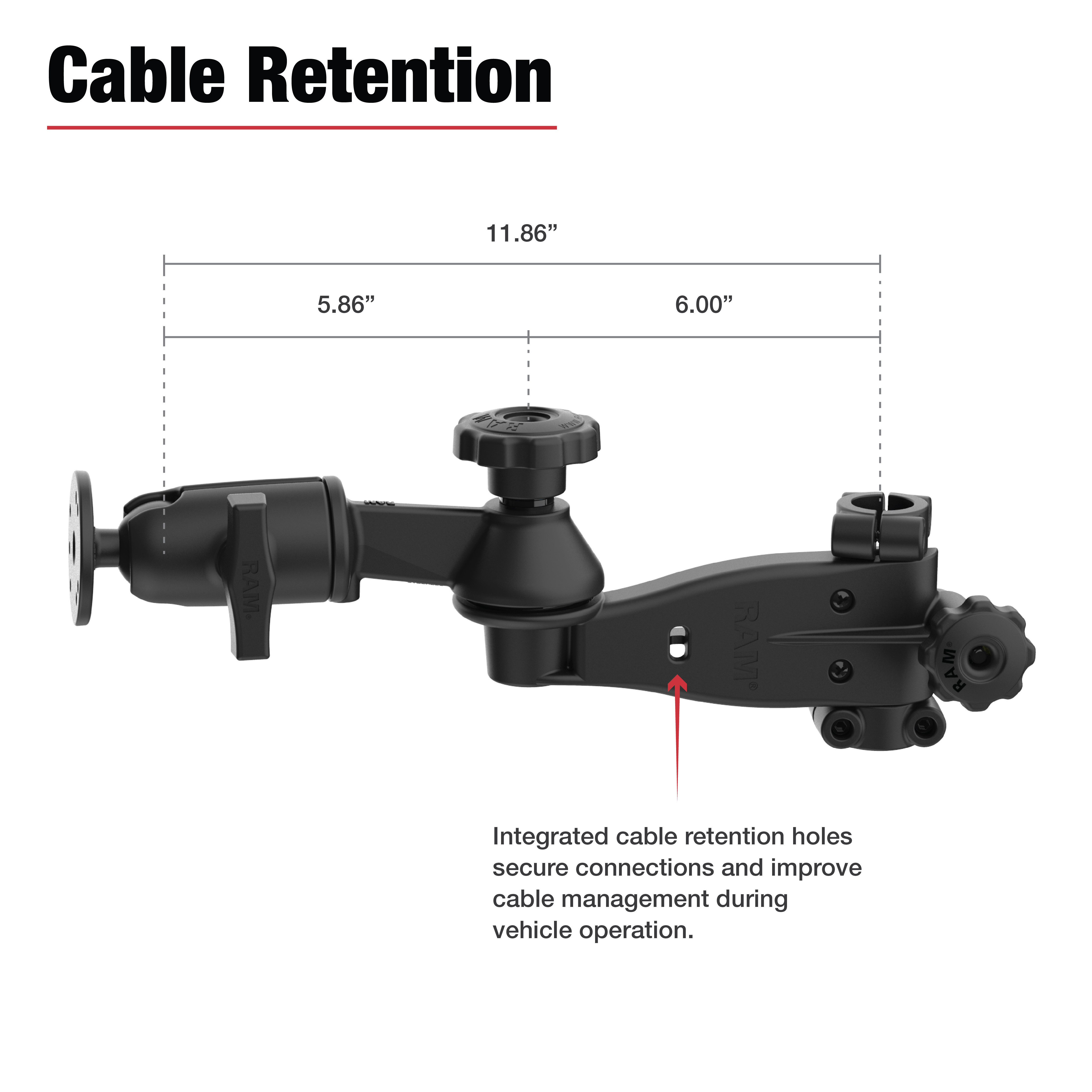 The RAM Friction Hinge 15.24cm (6") Arm & 15.24cm (6") Swing Arm with Ball for Tough-Bar (RAM-TB-FHA3-SW1BU) is a versatile attachment designed to mount a keyboard or other accessories to the RAM Tough-Bar with smooth, controlled adjustability. This system combines a 15.24cm (6") friction hinge arm, a 15.24cm (6") swing arm, and a C size RAM ball for full multi-axis positioning. The friction hinge delivers precise single-axis pivoting, ideal for moving a keyboard side to side, while the swing arm adds 360 of horizontal rotation. The integrated ball and socket connection allows for fine tilt adjustments, letting you position your accessory exactly where you need it or quickly move it aside to access vehicle controls. The built-in cable retention feature keeps cords neatly organized and secured along the arm, preventing snags or strain during adjustment. For added protection, the Collar-Lock system acts as a rotational limiter, blocking over-rotation that could send the mount into the dashboard during movement or impact. Together, these components ensure stable, vibration-resistant performance in demanding environments. Complete with a round ball base for compatibility across the RAM Mounts ecosystem, the Friction Hinge 15.24cm (6") Arm & Swing Arm for Tough-Bar offers rugged flexibility and clean cable management for fleet, commercial, and personal vehicle setups.