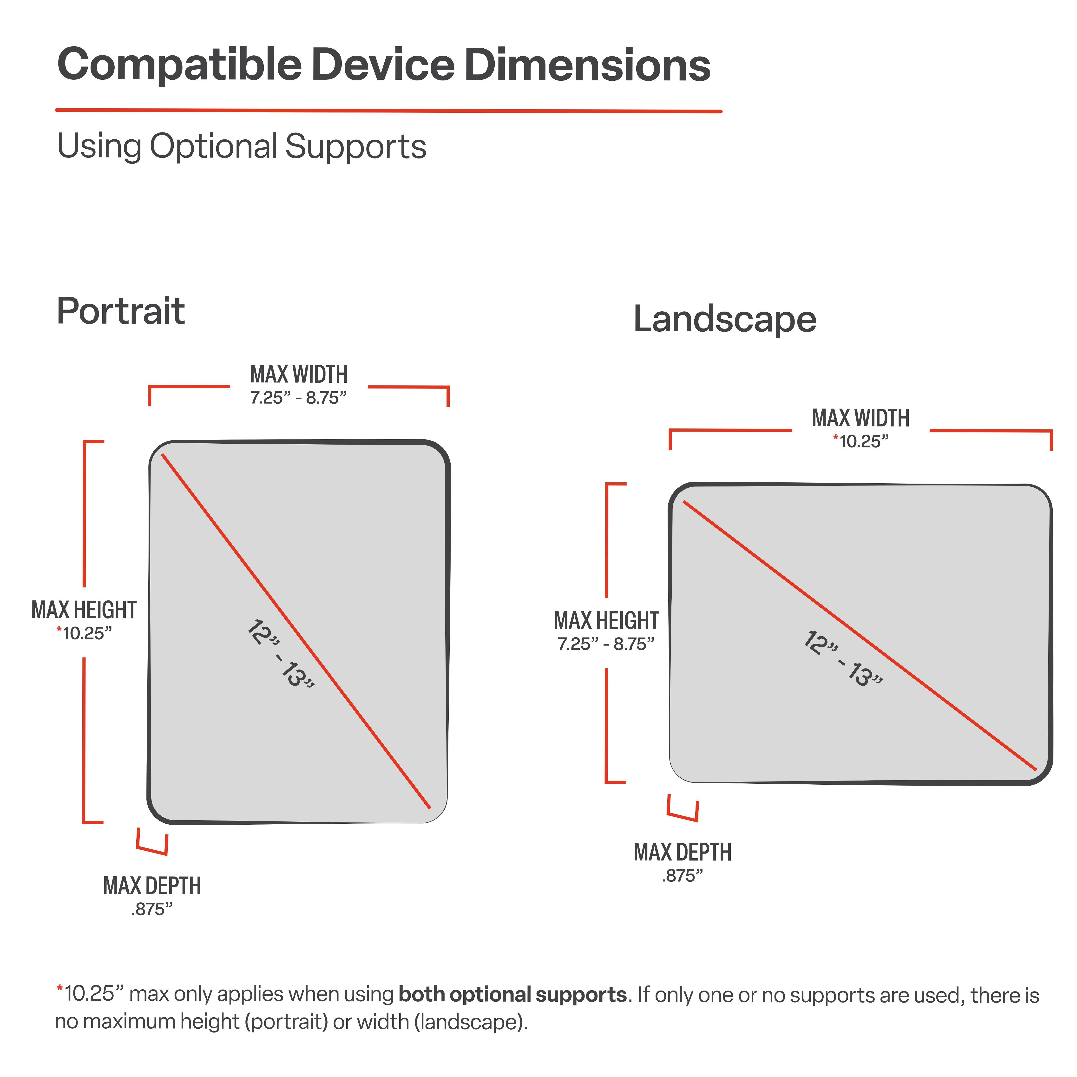 Max Height: 26.04cm (10.25") (using optional supports)Width Range: 18.42cm (7.25") - 22.23cm (8.75") Max Depth: 2.22cm (0.875")